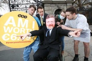 *** NO REPRODUCTION FEE *** DUBLIN : 6/02/2014 : Pictured (l-r) at the launch the ‘Everyone Loves Nurses’ campaign organised by The Union of Students in Ireland (USI) were student representatives and student nurses Sean Kearns, Joe O’Connor, Rebecca Mitchell, Paddy Guiney with Dr James Reilly TD look a like. The launch was held ahead of a larger demonstration that will take place in a fortnight at the HSE. The starting salary for newly graduated nurses is now €22,000, a drop of €4,000 from the past starting salary of €26,000. This works out as €6.49 per hour. This is less than the current minimum wage of €8.65. The same graduate nurses can earn far more abroad, up to €43,614 in Canada. USI and student nurses from across the country are telling Minister James Reilly, who previously said they can “emigrate or work in a fast food service if unhappy”, that they’ve had enough. USI President Joe O’Connor said: “The message to Minister Reilly today is loud and clear; change the starting salary level back to €26,000 for newly graduated nurses. Follow the campaign on Twitter using the hashtag #everyonelovesnurses. Picture Conor McCabe Photography.